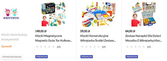 To najpopularniejszy format reklamowy, którego głównym celem jest widoczność ofert oraz sprzedaż. Produkty sponsorowane wyświetlają się w wynikach wyszukiwania oraz na stronach kategorii, wyglądając bardzo podobnie do ofert organicznych, ale zajmując przy tym kluczowe, najlepiej widoczne pozycje.
